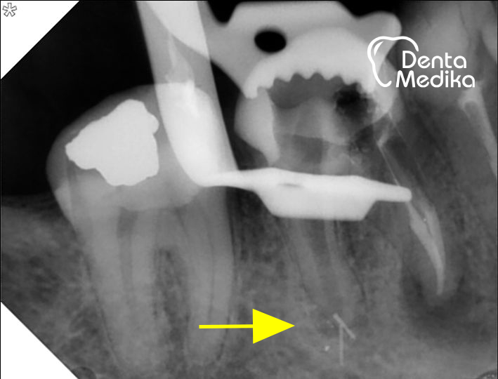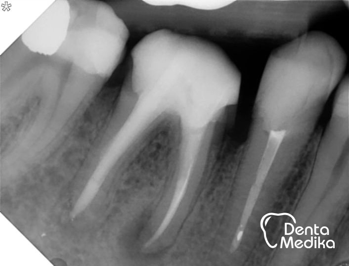 Do naší ordinace se dostavila slečna s bolestí dolní šestky. Nevěděla, proč jí zub bolí, když už byl nerv vytažen předchozím lékařem. Zhotovili jsme rentgenový smímek a zjistili, že kanálky sice někdo plnil, ale nedokonale. Jednalo se pravděpodobně o situaci, kdy lékař ve snaze o co nejnižší cenu ošetření zvolil nejrychlejší variantu a dal přednost kvantitě před kvaliltou. Takové ošetření může sice krátkodobě fungovat, ale většinou se později vymstí.